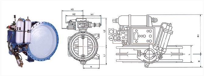 1、本閥的驅動系統為中同壓兩級驅動裝置,該裝置體積小而蝶閥啟閉速度的調控范圍大,初開啟段為高壓小流量控制,使蝶閥開啟瞬間狀態平緩,無劇烈波動,完全清理系統內的水錘隱患,然后將切入較快的轉動角速度,液壓缸將以設定的理想推力與速度將蝶板平穩打開。