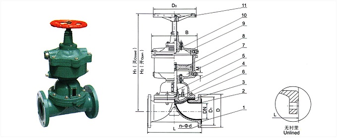 Parts List: 1, Body 2, Body Lining 3, Diaphragm 4, Disc 5, Lower Stem 6, Cover 7, Cylinder 8, Piston 9, Cylinder Head 10, Upper Stem 11, Handwheel