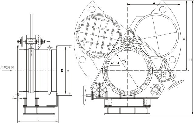 F343CX蝸輪扇形眼鏡閥又稱蝸輪扇形盲板閥,蝸輪翻板閥,蝸輪扇形閥,由左閥體、中閥體、右閥體、扇形盲板、絲桿螺母、不銹鋼補償器、兩個蝸輪傳動機構等組成。它是通過三根絲桿連成一體,并把三個閥體分別固定在底座上,構成一個剛性結構體。中閥體與右閥體用不銹鋼膨脹管連接,左、中閥體分別用三根兩端帶左右梯形螺紋的絲桿連接,將三根絲桿同時作正向(或反向)旋轉,則左、中兩閥體得到壓緊(或分離)。三根絲桿中上面一根絲杠中間裝有盲板,盲板繞該軸心旋轉。下面兩根絲桿在同樣的部位上安裝有盲板的定位塊,盲板旋轉時可以防止盲板漂移,避免密封圈擦傷,其中一根絲桿上裝有蝸輪傳動機構,實現松開夾緊閥體的目的。
