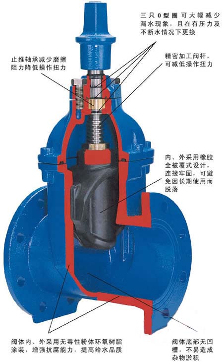 彈性座封閘閥也稱軟密封閘閥,彈性座封閘閥采用無凹腔結(jié)構(gòu),閥體閥蓋內(nèi)外表面噴涂環(huán)氧樹脂,閘板表面包覆橡膠,這樣從根本上杜絕了腐蝕發(fā)生的可能性,閥桿密封處舍棄填料而采用“O”形密封圈,使得蜜蜂更加可靠。根據(jù)需要,本閘閥可以采用操作桿、手輪、電動(dòng)及氣動(dòng)等方式操作。