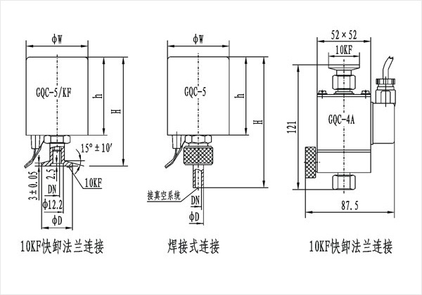 GQC-1.5 GQC-5型電磁高真空充氣閥是以電磁力為動力,當接通電源時,閥門被關閉,使真空系統與大氣隔離;切斷電源時,閥門處于開啟狀態,隨之大氣由外界引入真空系統。GQC-4A型電磁高真空充氣閥具有通電開啟和通電關閉兩種功能,閥內帶有空氣過濾器,可用作向真空系統充氣。